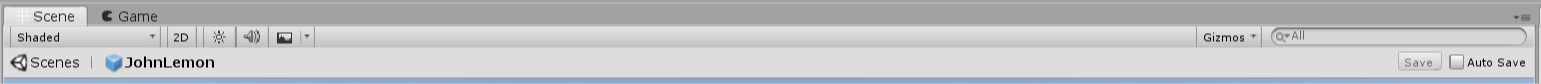 Unity Editor is now in Prefab Mode. This mode takes you out of the Scene you were editing before, and puts you in a temporary Scene with just the Prefab. The Scene view has changed slightly: at the top there is a new bar which says Scenes | JohnLemon on the left and has a checkbox labeled Auto Save on the right.