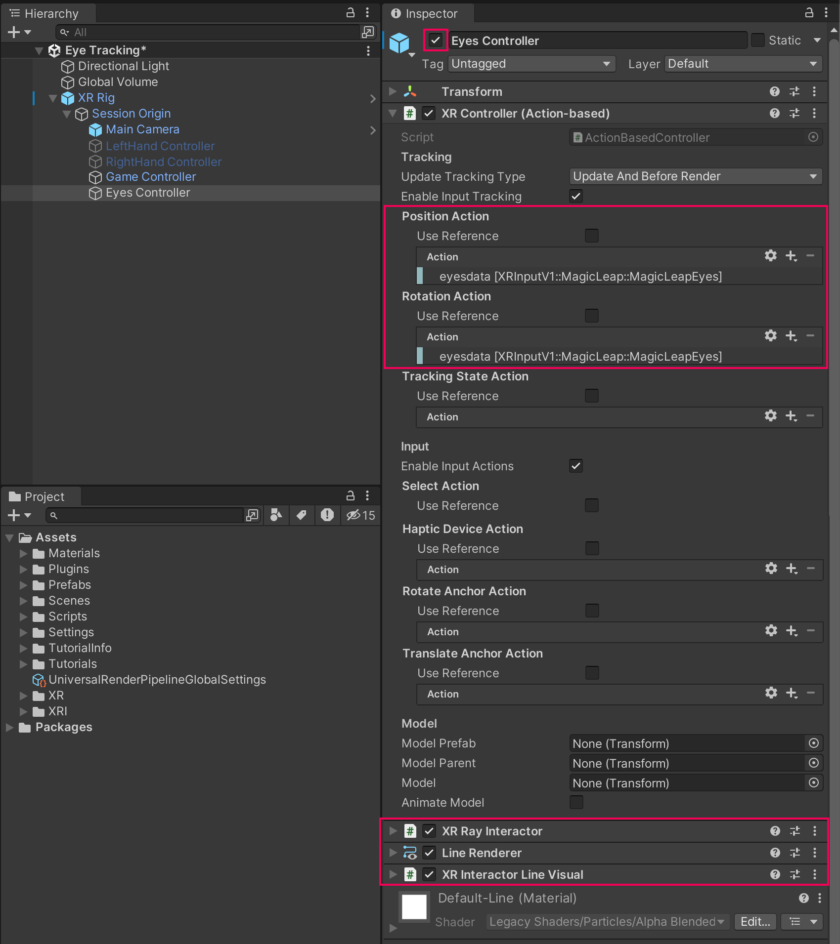 Notice that the Eyes Controller GameObject uses eyesdata for input instead of left or right hand data. The Eyes Controller comes with an XR Ray Interactor component, a Line Renderer component, and an XR Interactor Line Visual component, just like a default controller in Unity’s XR Interaction Toolkit (XRI).