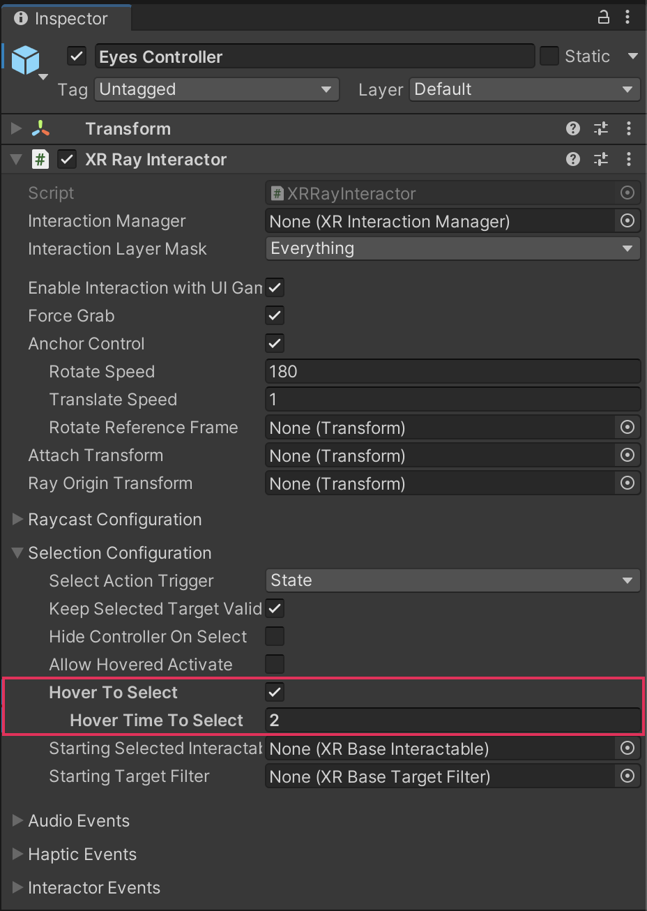 1. In the XR Ray Interactor component for the Eyes Controller GameObject, enable the Hover to Select property, and set the Hover Time to Select property to a value between 1 and 2 seconds.