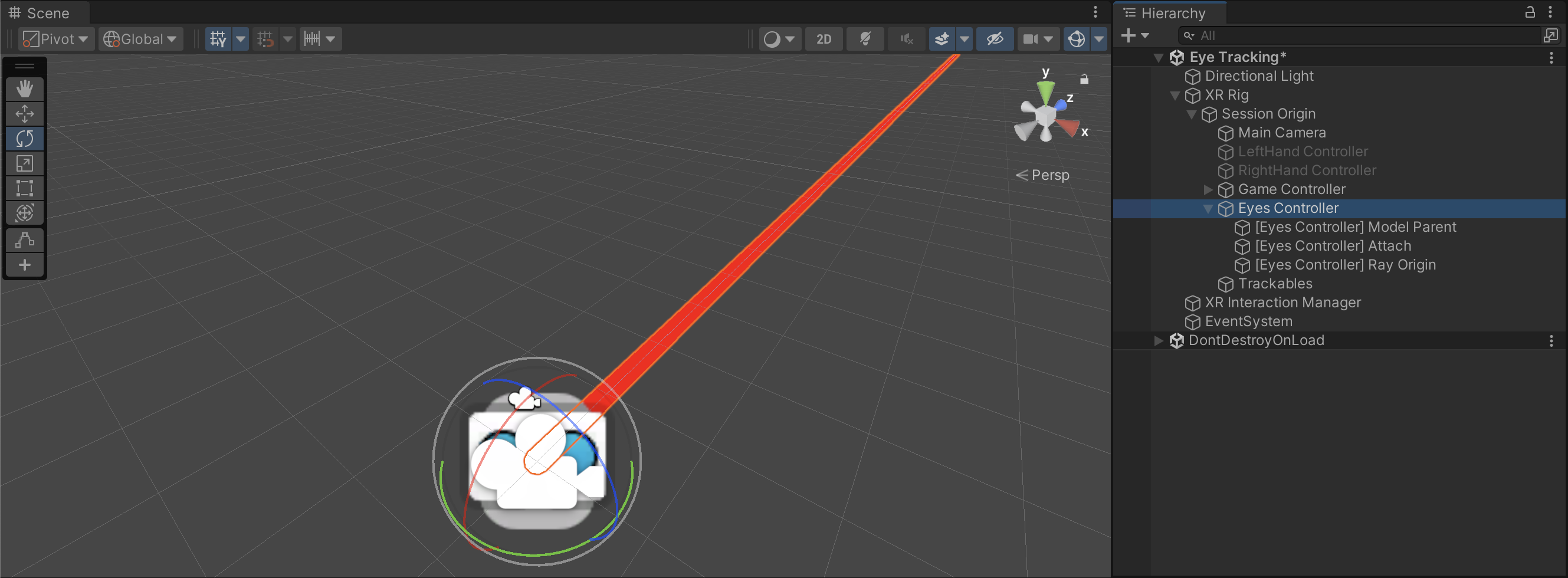 When you enter Play mode, you’ll see additional rays coming from the XR Rig, representing the user’s eye gaze.