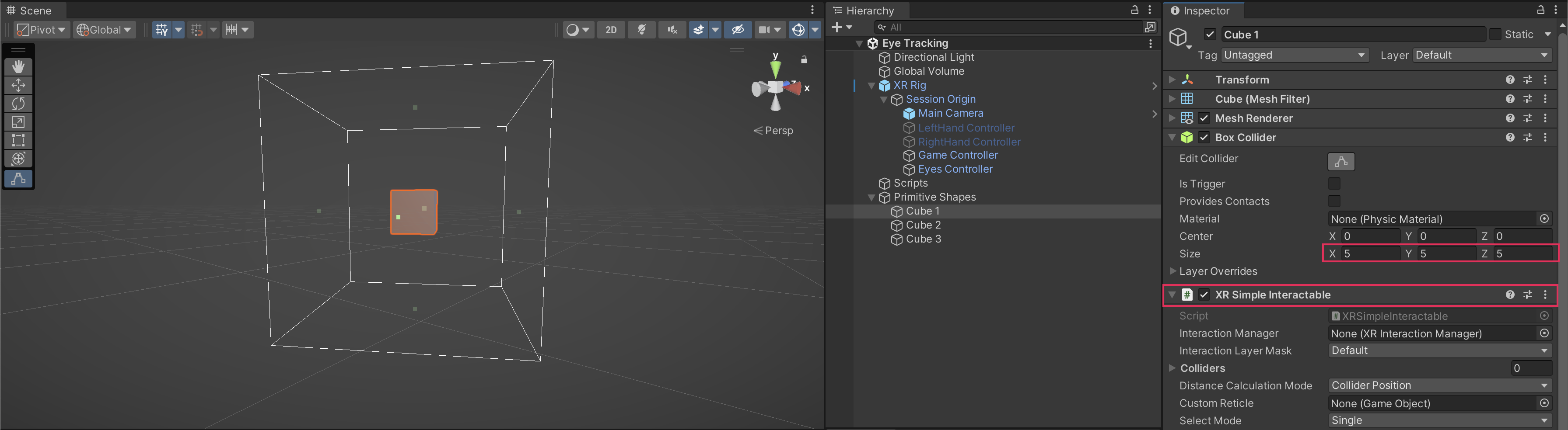 3. Add a simple 3D object to your scene and add an XR Simple Interactable component to it. Increase the size of the collider around the object so that you don’t need to look directly at the object to activate it.
