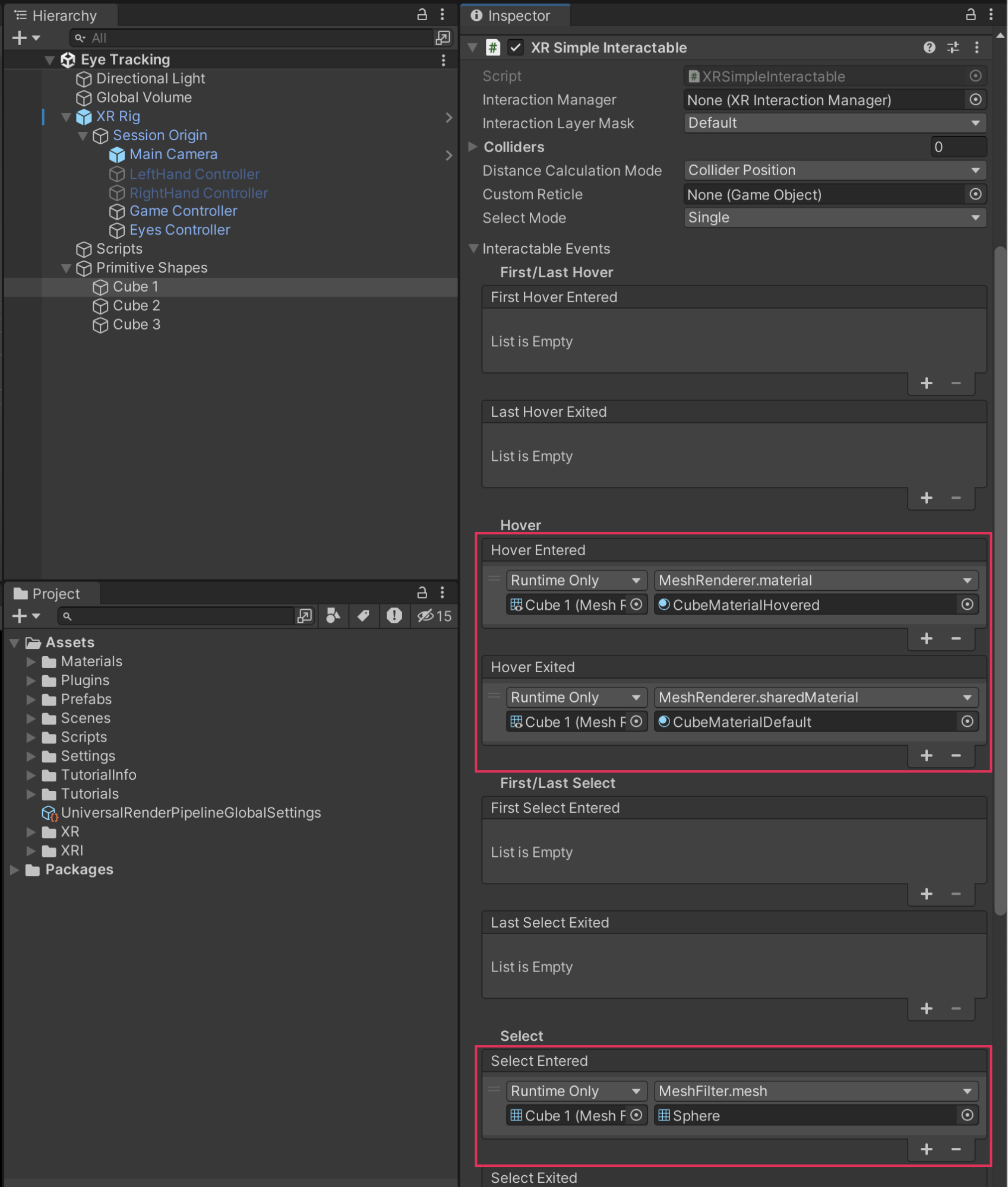 In the example below, the cube’s material changes on Hover Entered, reverts on Hover Exited, and changes to a sphere on Select Entered, which should trigger after hovering for more than two seconds. You don’t need any custom scripts for this functionality.