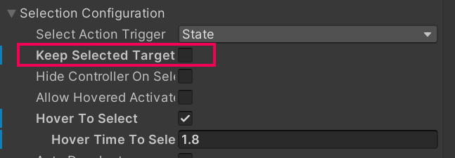2. Disable the Keep Selected Target property. This ensures you can deselect the cube by looking away from it.