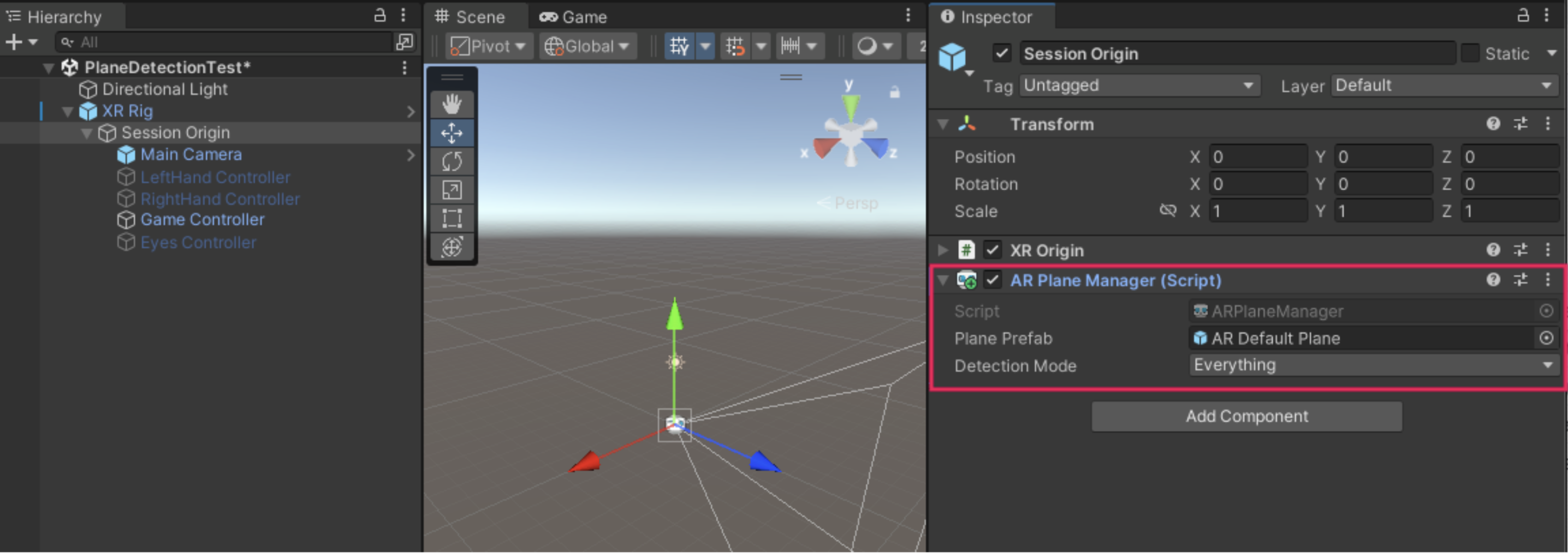 You only need one new component to get basic plane detection set up in your scene: the AR Plane Manager.