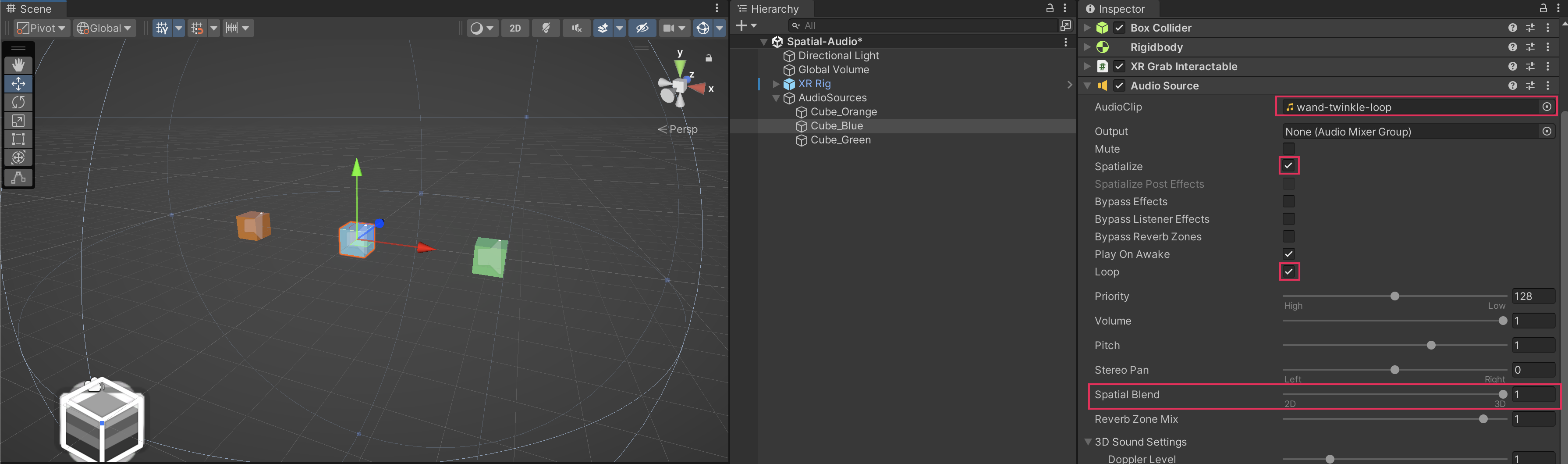 Now that your camera is configured, add a few simple objects to the scene, such as grabbable cubes that you can move around. Add Audio Source components to these objects and select an Audio Clip for those sources. For your convenience, we have provided a few simple sounds for you to experiment with. You may also want to enable Looping for testing purposes. Configure the Audio Source as you typically would for spatial audio by enabling Spatialize and set the Spatial Blend to 3D.