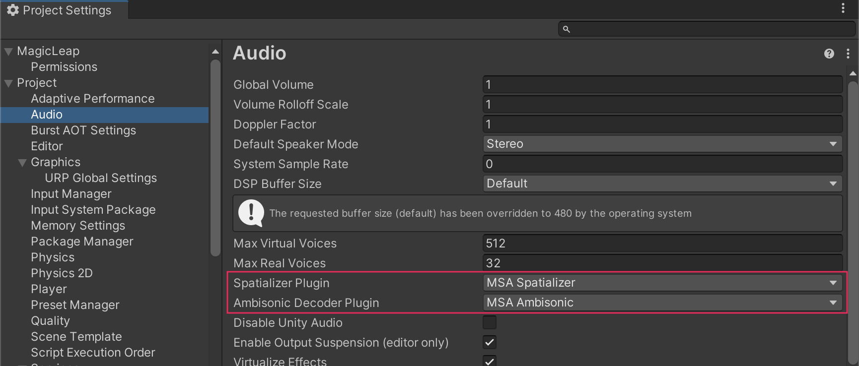 Once the Plugin is installed, all that remains is to enable it in your project. In the Audio section of the Project Settings tab, set the Spatializer and Ambisonic Decoder plugins to MSA Spatializer and MSA Ambisonic, respectively.