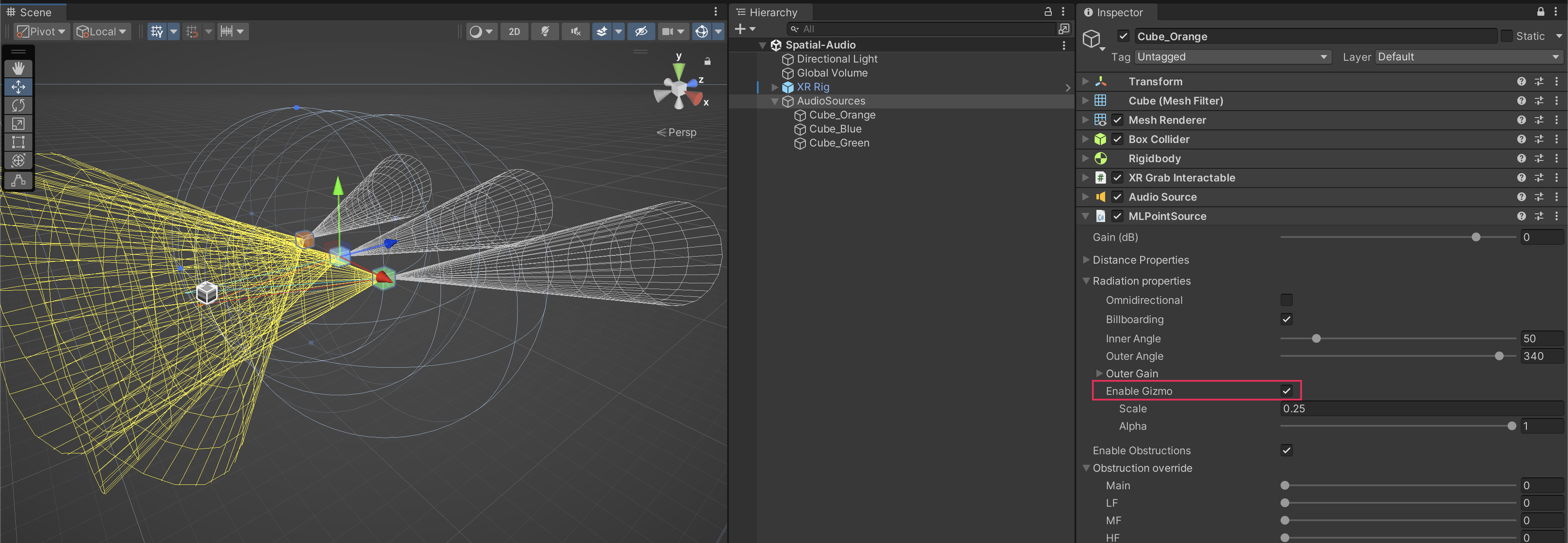 Once the basic Audio Sources are configured to your liking, add an MLPointSource component to the audio source GameObjects. These additional options will allow you to configure other, more nuanced sound properties for the audio for your environment, which you can learn much more about in Magic Leap’s documentation on this component. If you select Enable Gizmo, you will be able to visualize some of these properties in the Scene view.