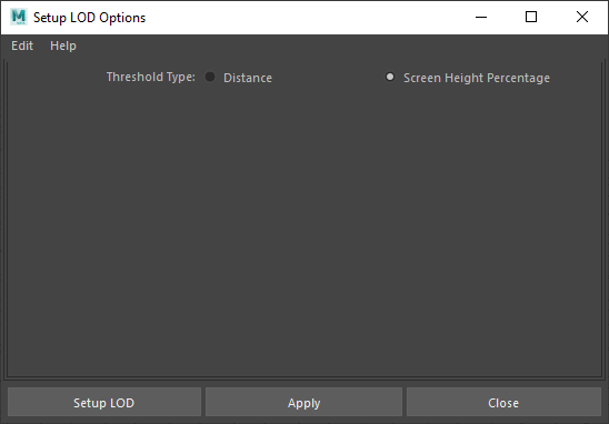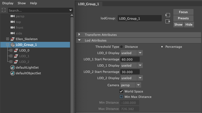 Note: The LOD Start Percentage values change the Screen Height Percentage, which will display the LOD of the group based on the percentage of screen height the LOD Group fills up in the camera frame. When changing this value in Maya, you can preview how these percentages affect the LOD Group; however, these percentages will not be transferred to Unity’s LOD Group settings after the file is imported.