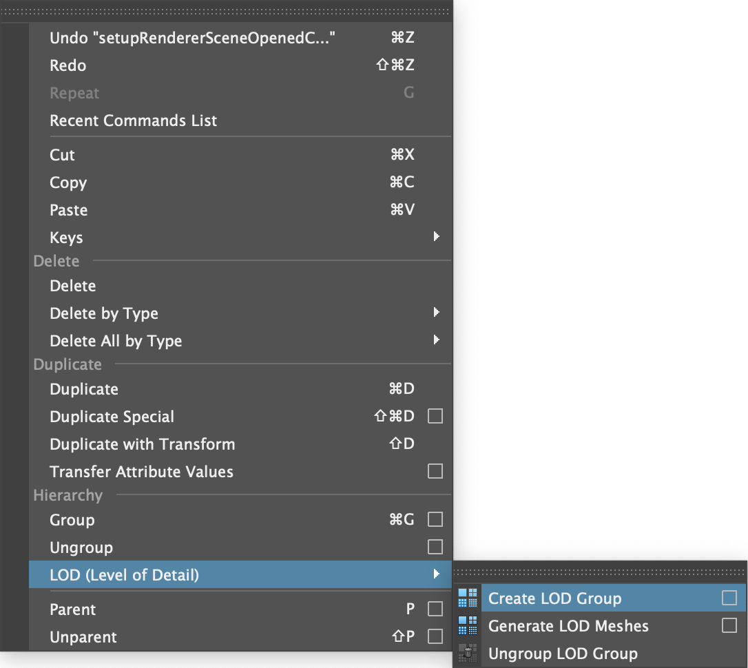 The LOD Group will be created in Maya and will contain the objects selected in the Scene prior to creating the group. If the Meshes were selected incorrectly, or are out of order, you can rename them in the Outliner or Attribute Editor to put them in the correct order.