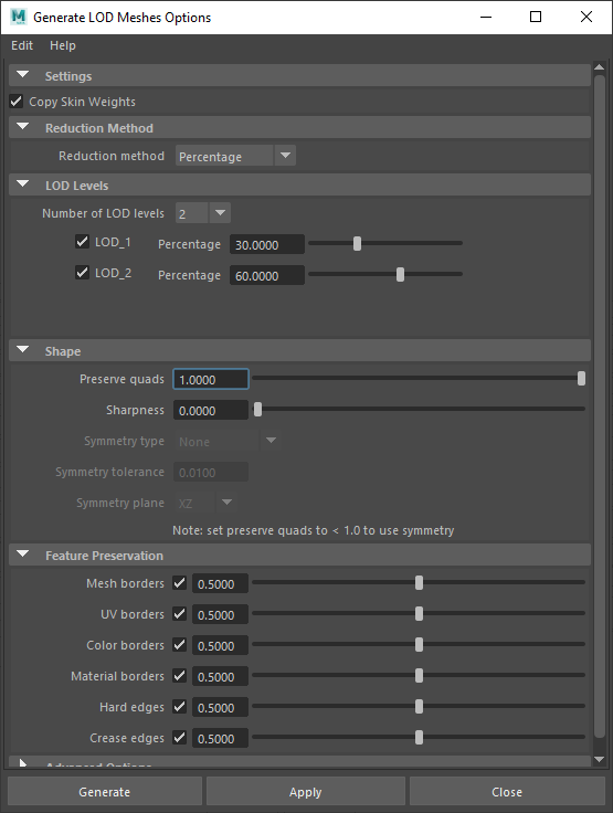 - Check the Copy Skin Weights option to keep the new LODs of a rigged character skin attached to the same rigged skeleton.