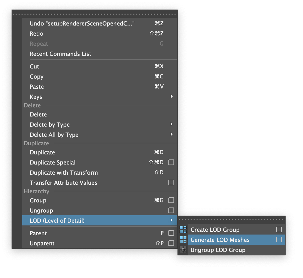 Maya provides a simple method to create LODs and organize them into a group. It can generate various lower-resolution Meshes based on a high-poly mesh and place them into an LOD Group prior to exporting to Unity.