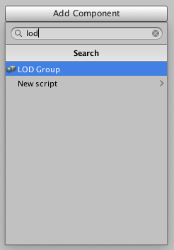 - In the search box of the Component Browser, type in “LOD,” and choose the LOD Group from the results. This will add the LOD Group component to the selected GameObject. (Figure 08)