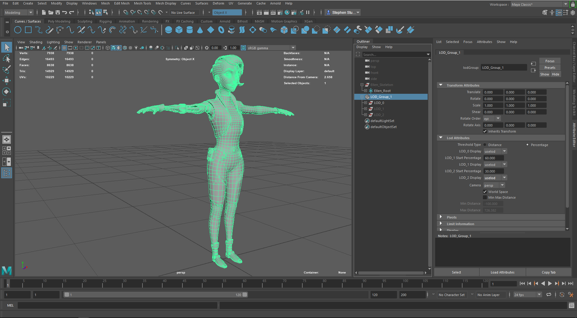 Maya automatically names generated LODs in numeric order. The highest polycount LOD is named LOD_0, which is active when the object is closest to the camera. Each LOD in the group will be named by sequentially higher numbers so that the LOD with the highest number will have the lowest polycount. You can create LODs using this method on a rigged character or an asset that doesn’t require rigging.