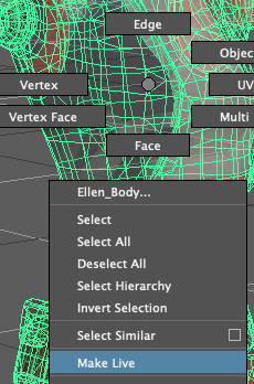 To set the object as live to allow the Quad Draw tool to function, right-click over the object and select Make Live from the Marking menu. When a surface is made live, the object’s wireframe color is dark green. (Figure 05)