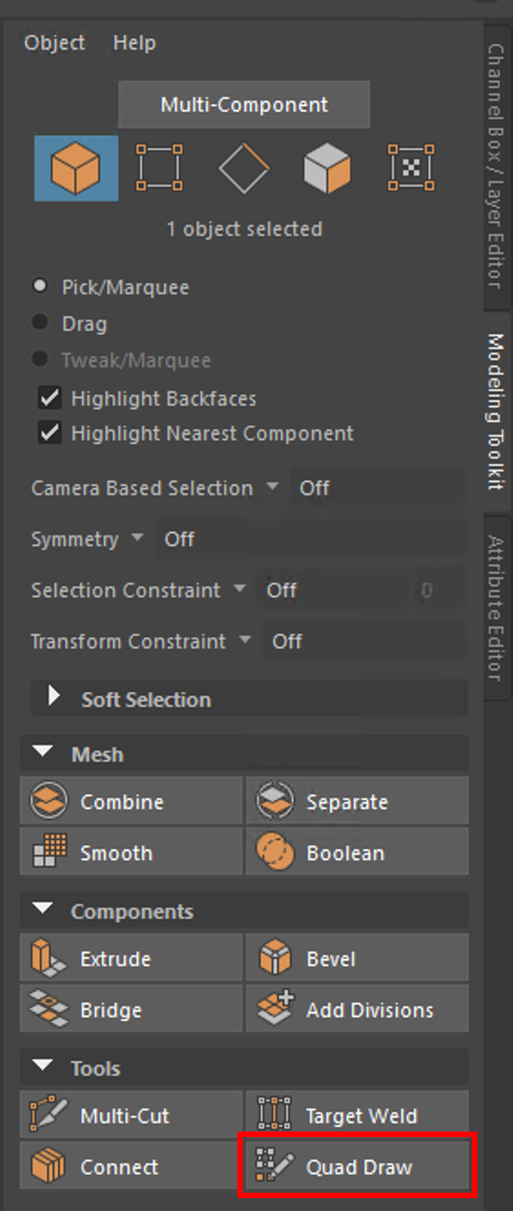 Enable the Quad Draw Tool by locating it in the Tools section of the Modeling Toolkit panel. (Figure 07)