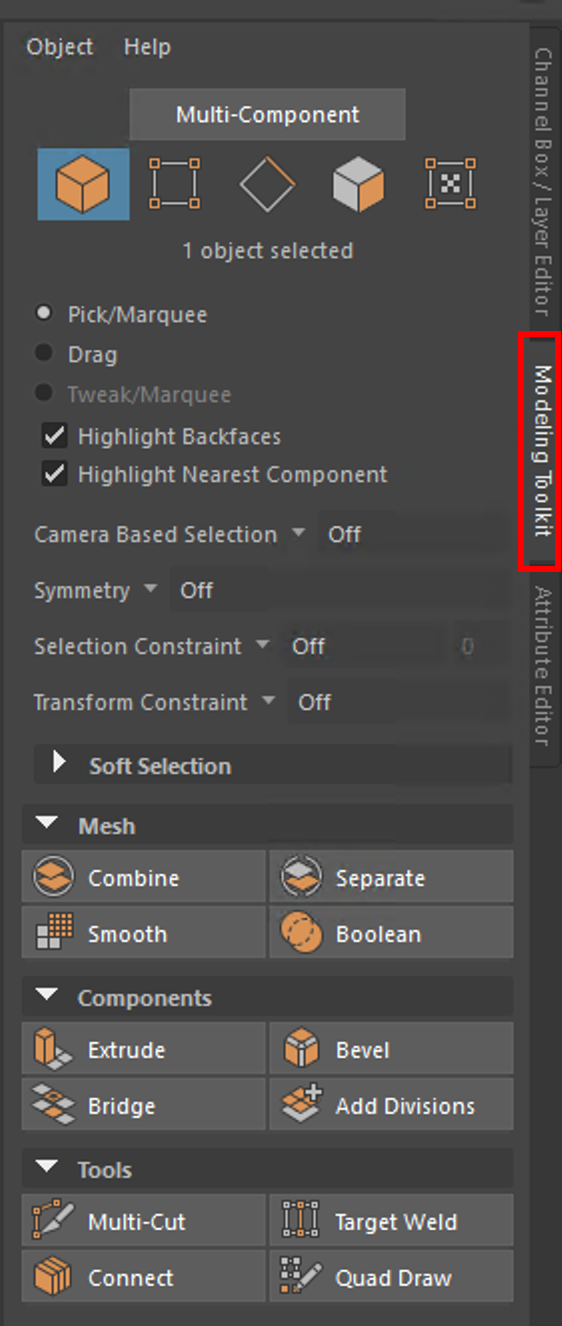 Open the Modeling Toolkit panel. It can be opened a few different ways, but the easiest is to select the vertical Modeling Toolkit tab on the right side of Maya. (Figure 03)
