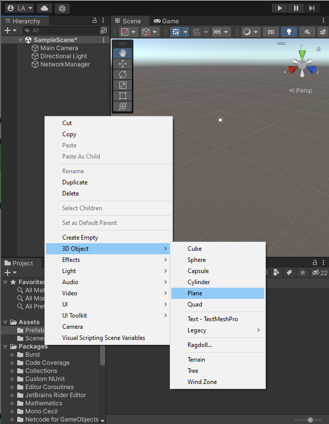 1. Create an empty GameObject (right-click in the Hierarchy window, then select Create Empty), and name it “NetworkManager”.
