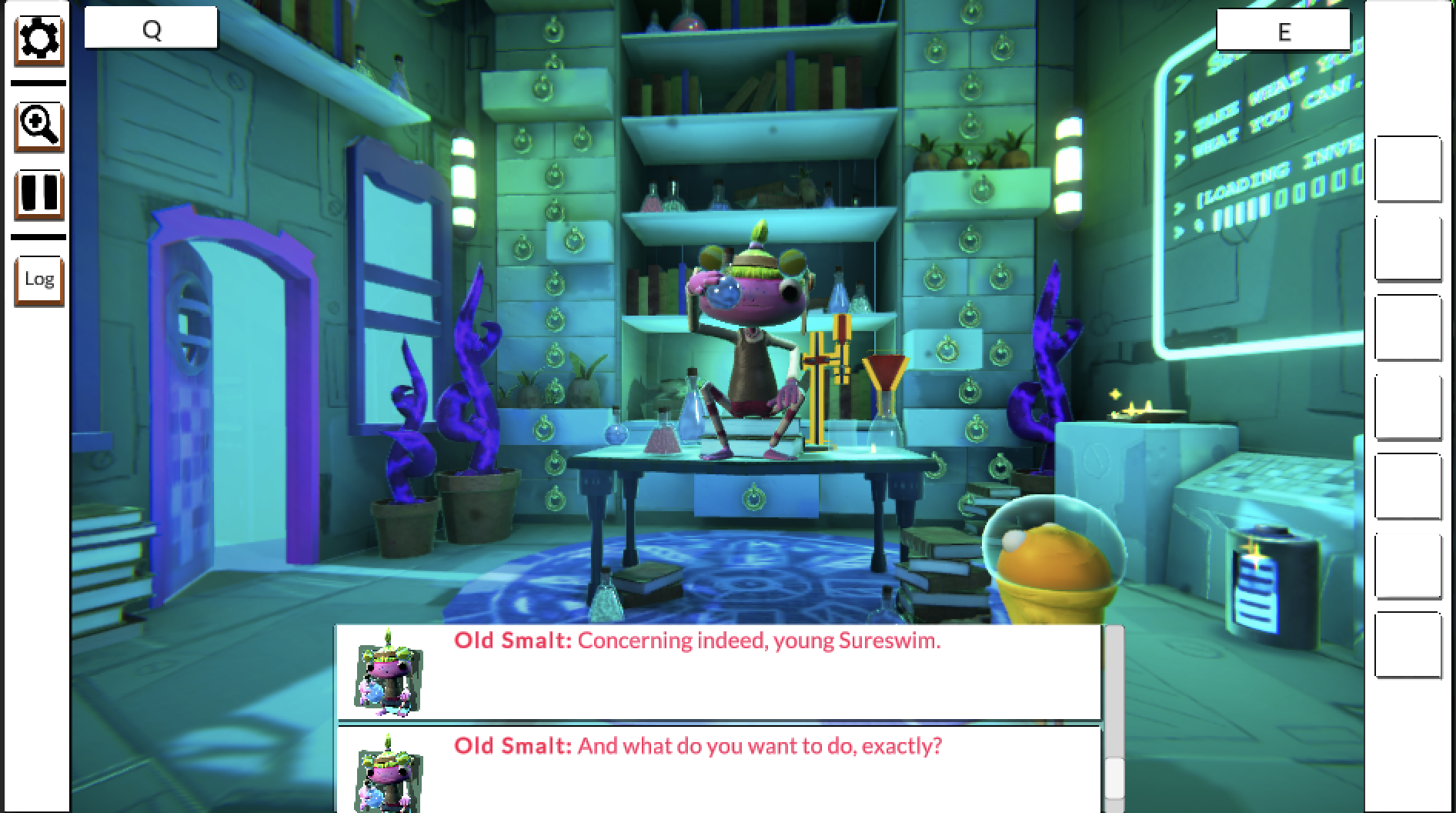 At this point in the conversation, the conversation system is waiting for the player to select a response from Sureswim. The camera focus is entirely on Sureswim; Old Smalt is not visible.