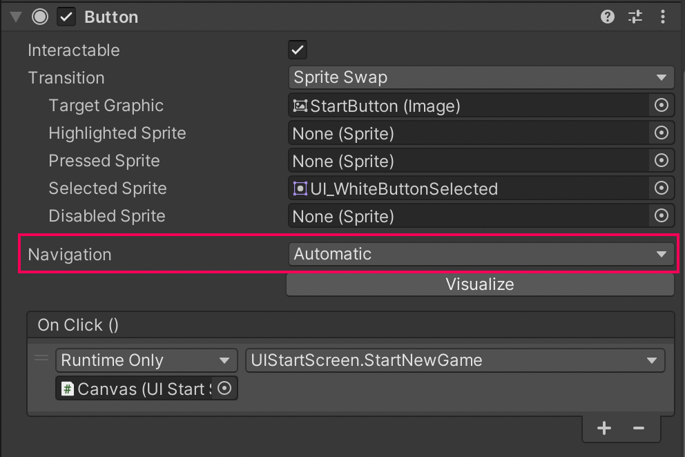 The uGUI system uses the Navigation property to determine the next UI GameObject that can be selected in a particular direction when the player provides input, such as a button, toggle, or slider. Every UI GameObject has this property available in the Inspector.
