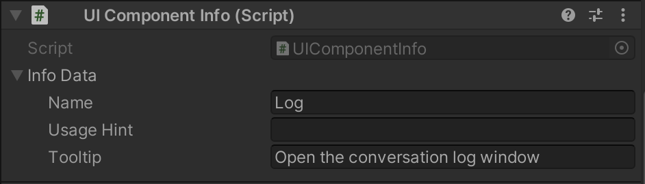 Here is the UI Component Info (Script) component for the Log button on the main gameplay UI:
