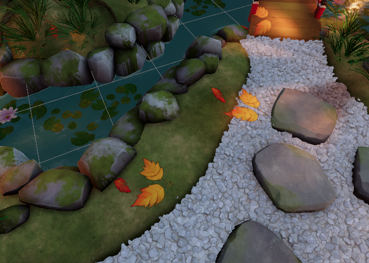 Currently, decals are used to show cherry blossom leaves on the ground in the scene.