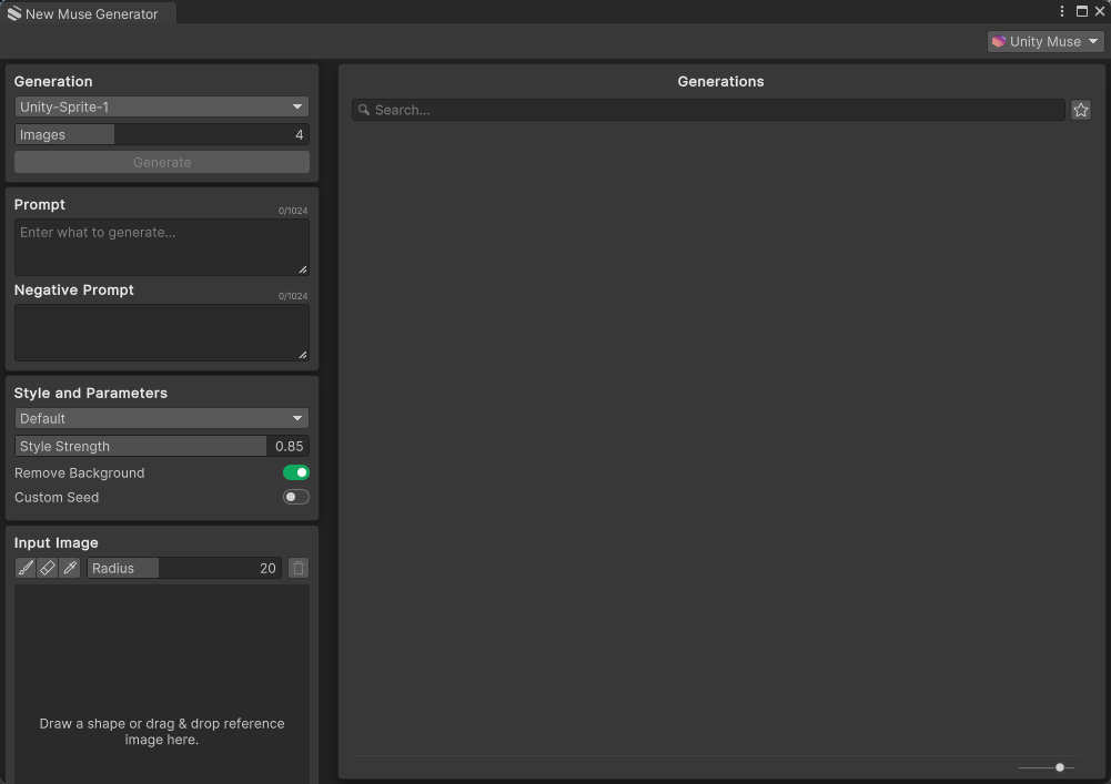 1. From the Unity Editor's main menu, select Muse > New Sprite Generator to open the Muse Generator window. Resize or dock the window as you see fit.