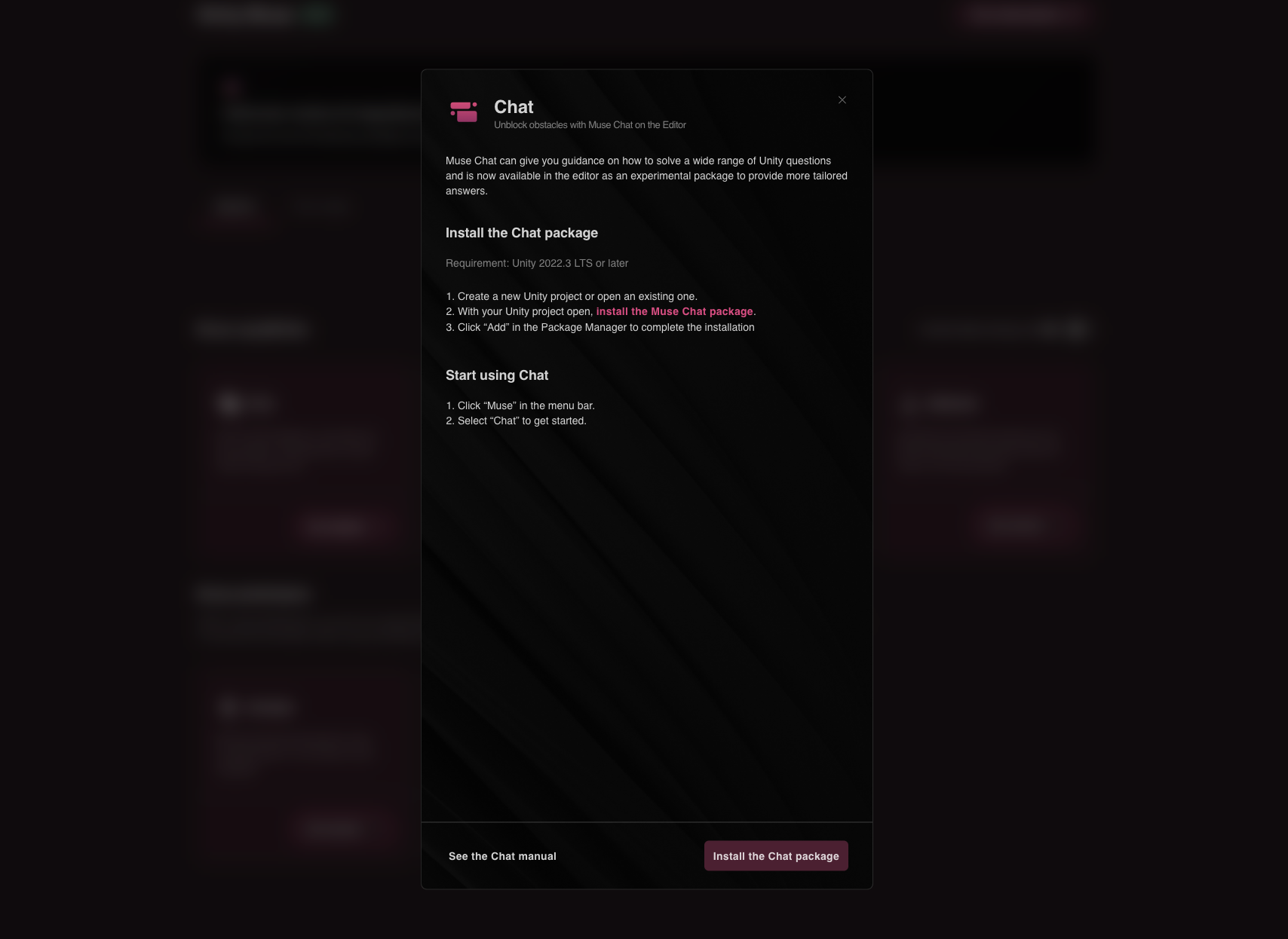 2. Select Get started on the Chat tile, then select Install the Chat package to add Muse Chat to your project.