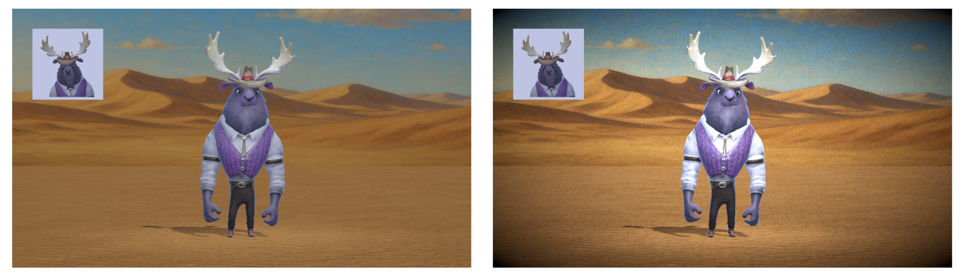 Use /ask in the Assistant window to get guidance on how to implement post-processing in your scene. This can give your scene a distinct and higher production look, especially with effects like bloom, depth of field, or color adjustments. The images below show an example scene before (left) and after (right) post-processing.