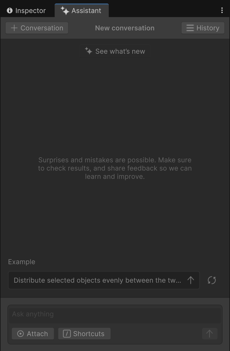 The Unity AI Assistant appears as a dockable window in the Editor. It includes several key areas that make it easy to interact with, view past chats, and attach project elements to your queries.