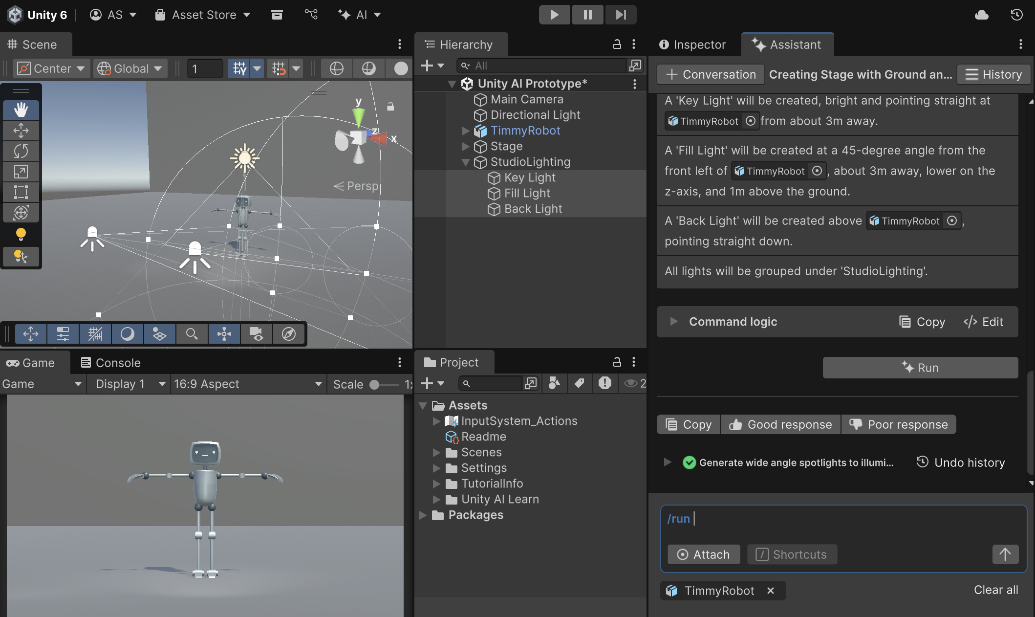 The /run mode lets the AI Assistant perform actions inside your Unity project — like creating GameObjects, modifying components, or organizing your Hierarchy window — using natural language. This makes it a powerful way to block out your scene quickly.