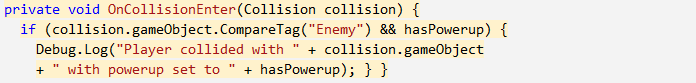 - 敵タグのブーリアン値 hasPowerup と Enemy タグの 2 つの条件をテストする if 文を作成します。