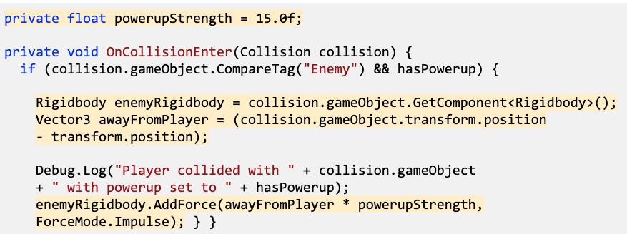 - 新しい変数 powerupStrength を使用して、敵に衝撃力を与えます。