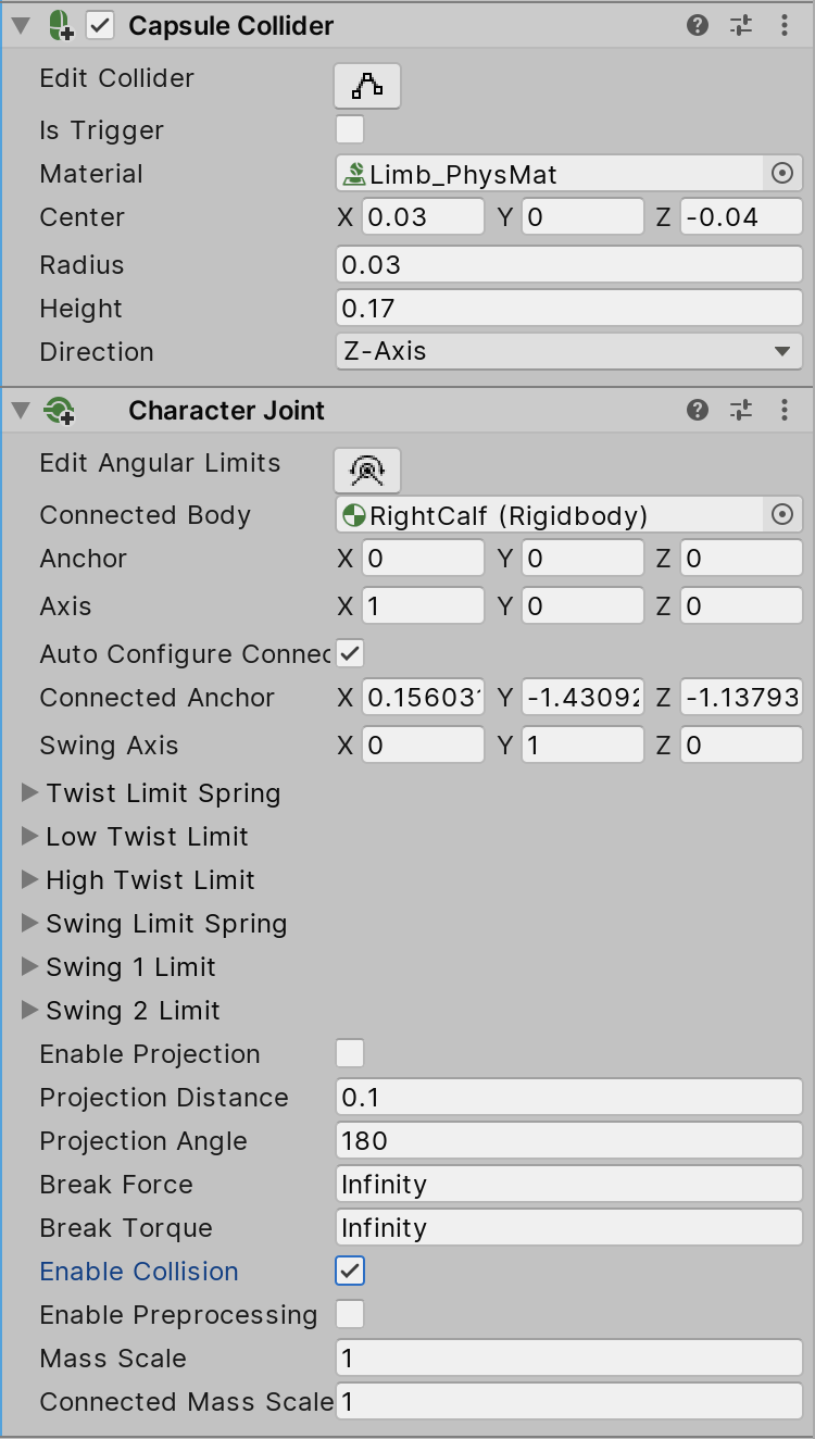 You can also turn on the Enable Collision checkbox if you want the Collider to collide with another connected joint (for example, hand, forearm, foot, lower leg). This option is best used on the last bone of a chain, like the hands or feet.