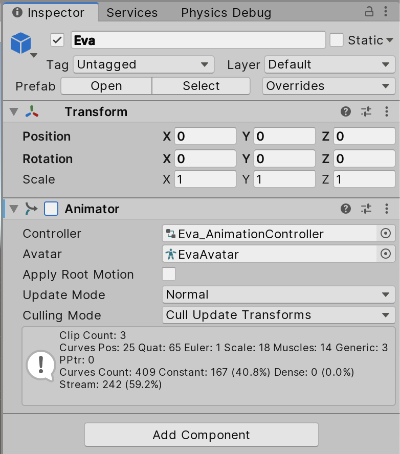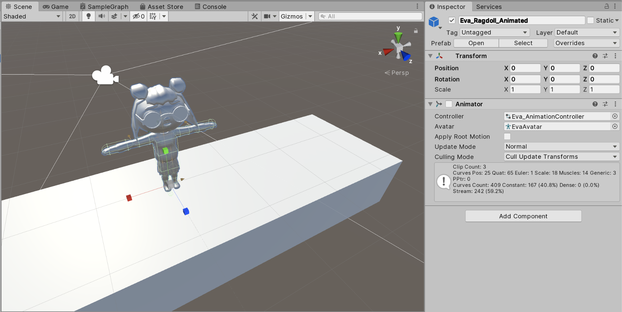 }Consequently the character’s Animator component is only enabled when the character is not in a Ragdoll state. The character will play an animation at random when in an animated state.