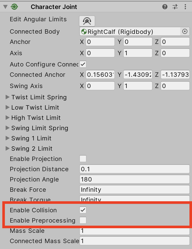 13.) Finally, in the Character Joint component, set Connected Body to the previous bone above it in the hierarchy. In this instance that would be RightCalf (Figure 11).