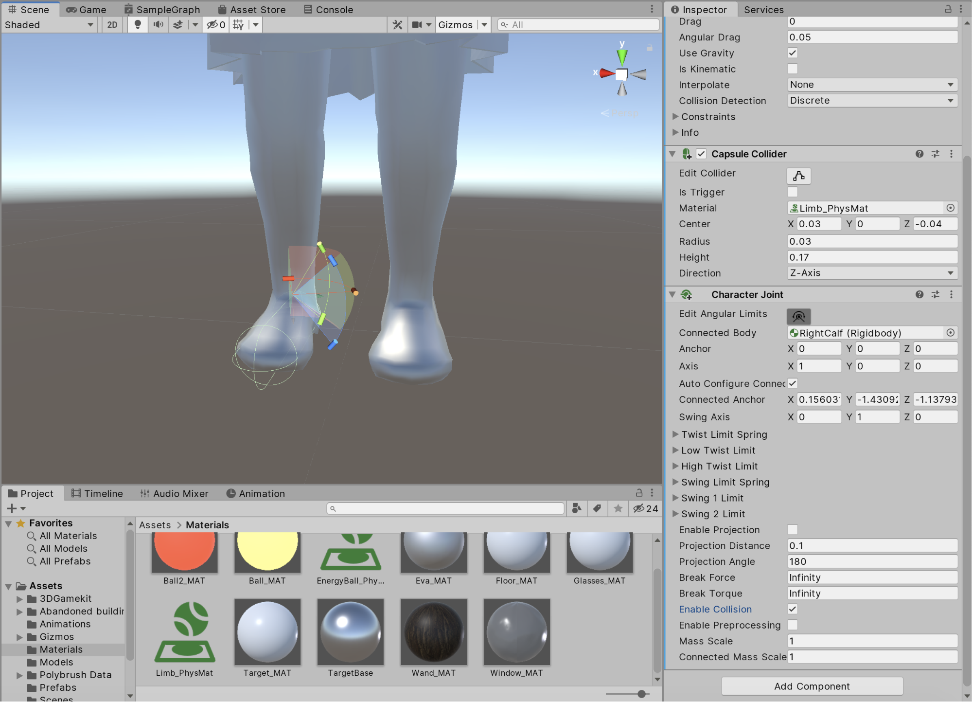 11.) If you click Edit Joint Angular Limits in the Character Joint component, you’ll see a new Gizmo in the Scene view. If you cannot see it, check to make sure you have only one Inspector window open (Figure 09).