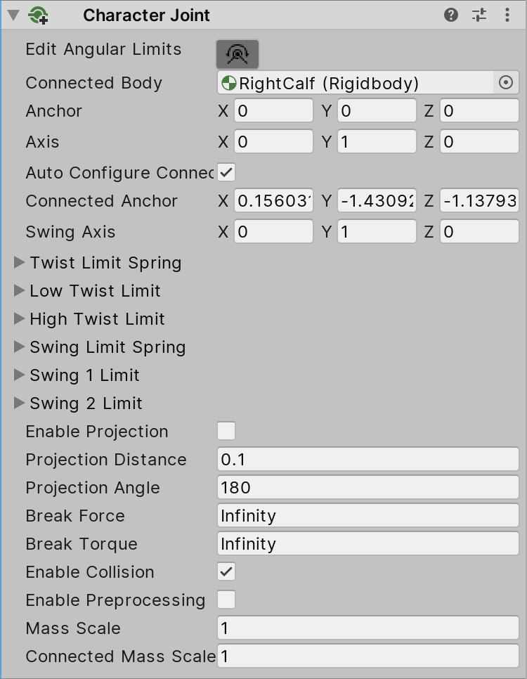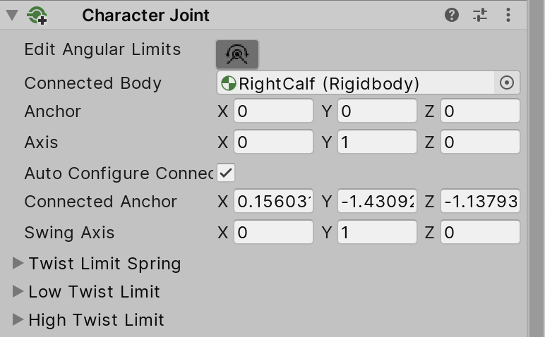 If the ankle motions don’t look correct, you may need to change the axis in the Character Joint so the twist axis (y-axis) is pointing up.