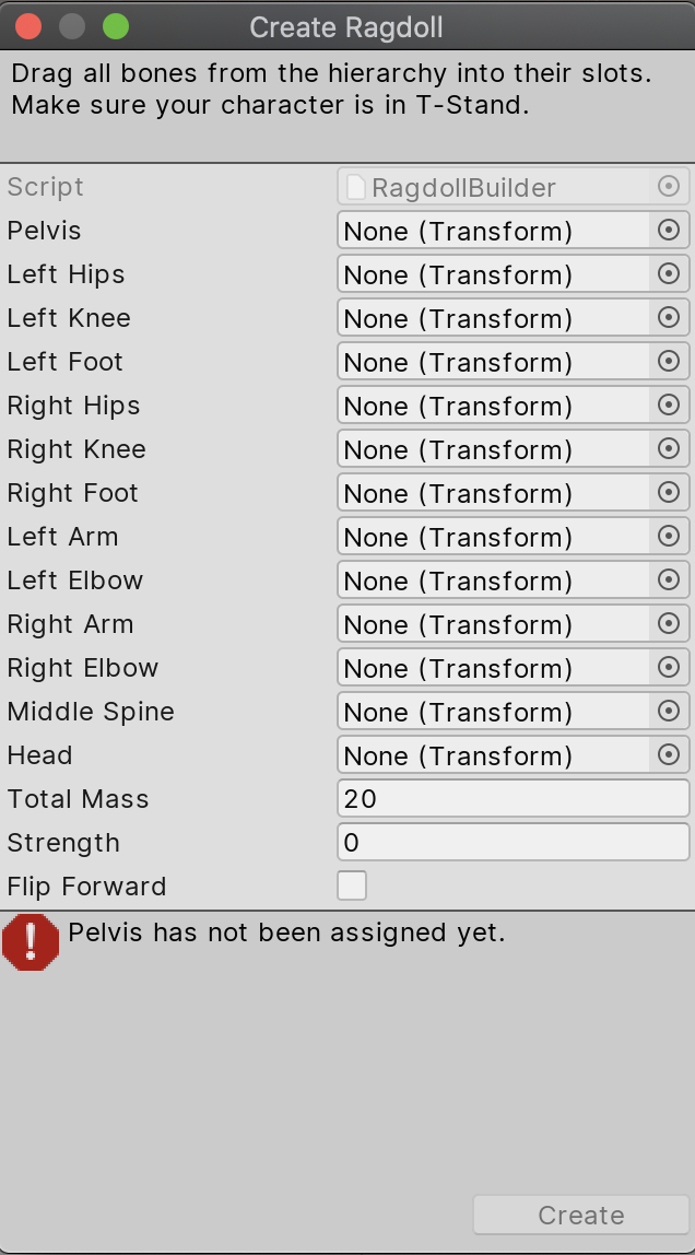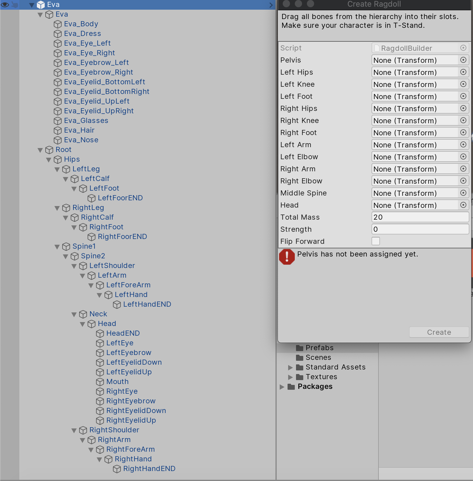 5.) From this list, drag the bones to the Create Ragdoll pop-up window as follows: