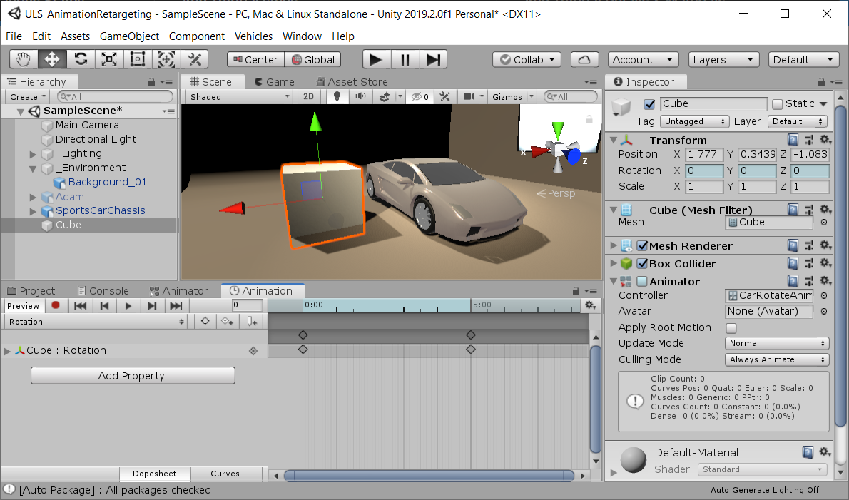- In the Inspector, add CarRotateAnimationController to the Animator Controller parameter in Cube's Animator component.