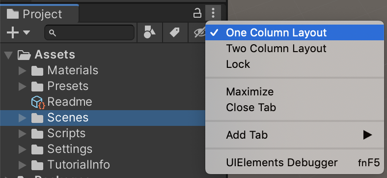 5. In the Project window, click the Context button (with the three vertical dots) in the upper-right corner. Then change the window setting from Two Column Layout to One Column Layout (Figure 02).