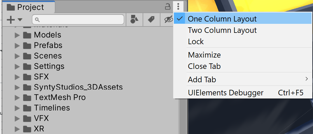 1. Dock the Project window underneath the Hierarchy window. We'll need to drag Assets into our Scene and then modify their properties in the Inspector, so it's best to have access to all three of these windows. Feel free to switch the Project window to One Column Layout by clicking the context button in the upper-right corner of the window (Figure 04).