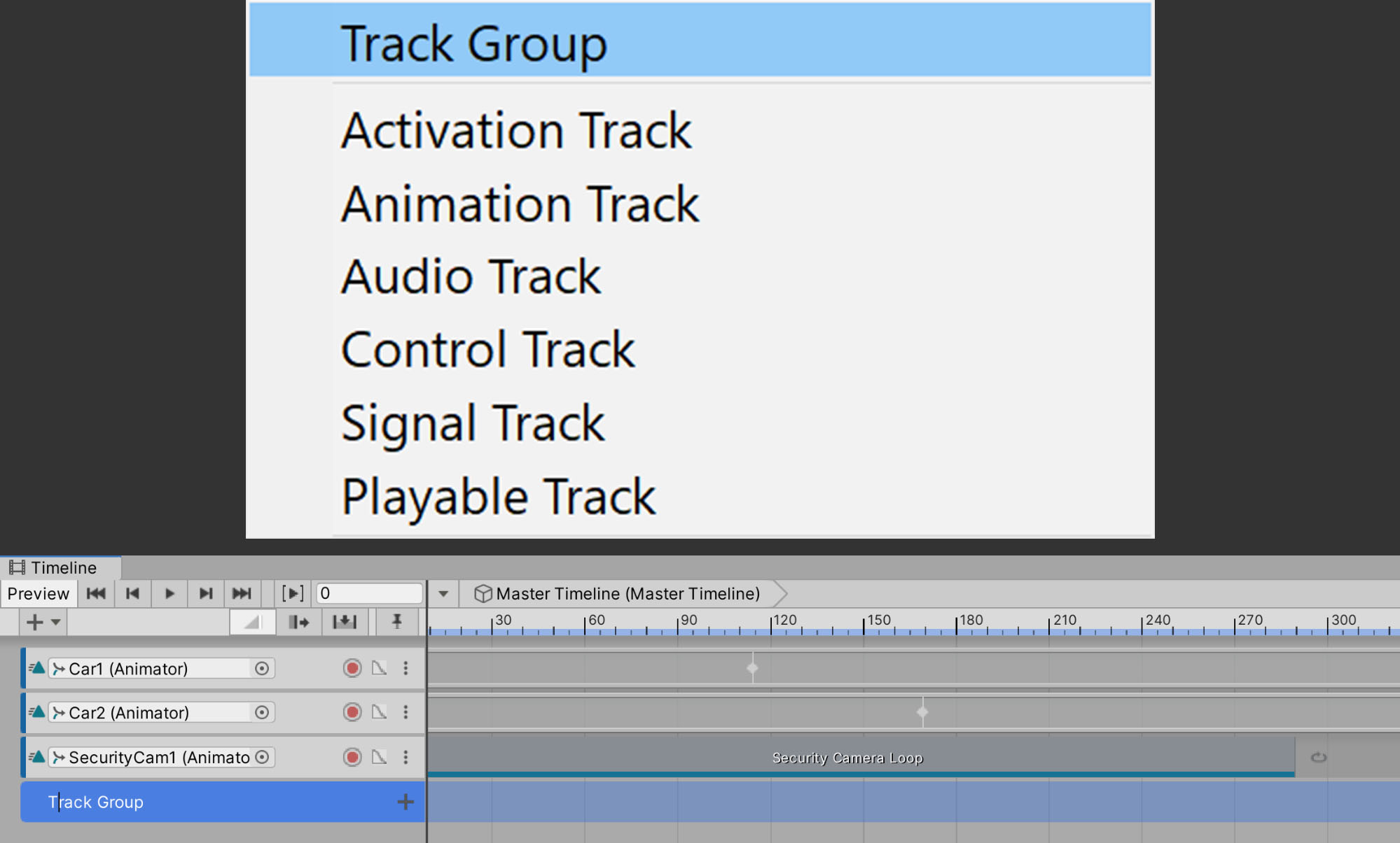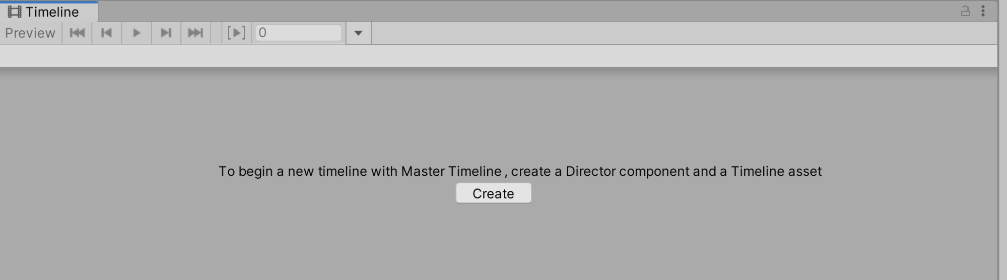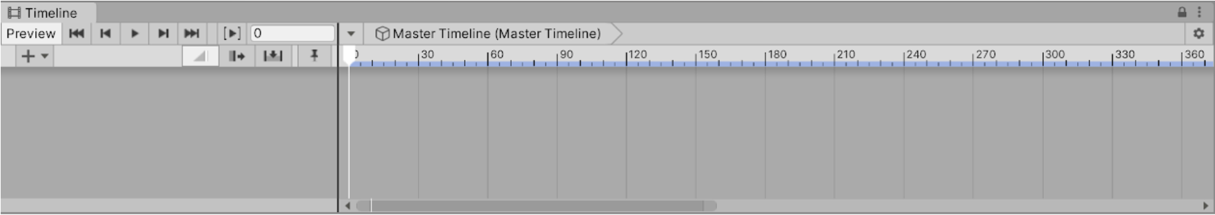 To start, we need to create a Master Timeline that will contain and control all of our animations in this Scene. The Timeline can be thought of as a sequence of various Animation Clips and triggers in your Scene, all of which can be edited together to orchestrate a story.