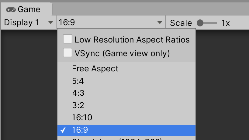 3. In the Game view, adjust the Display drop-down to 16:9. This will crop the contents of the window to a 16:9 (widescreen) viewport, allowing us to see everything that the camera sees (Figure 05).