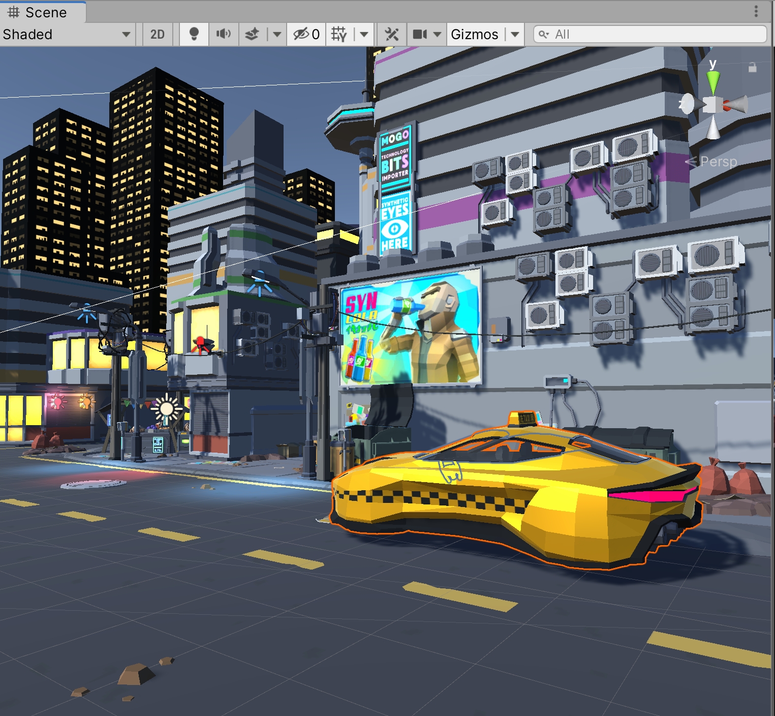 4. In the Scene view, position the car so that it’s on the far right side of the road, just before the Syn Cola sign (Figure 07).