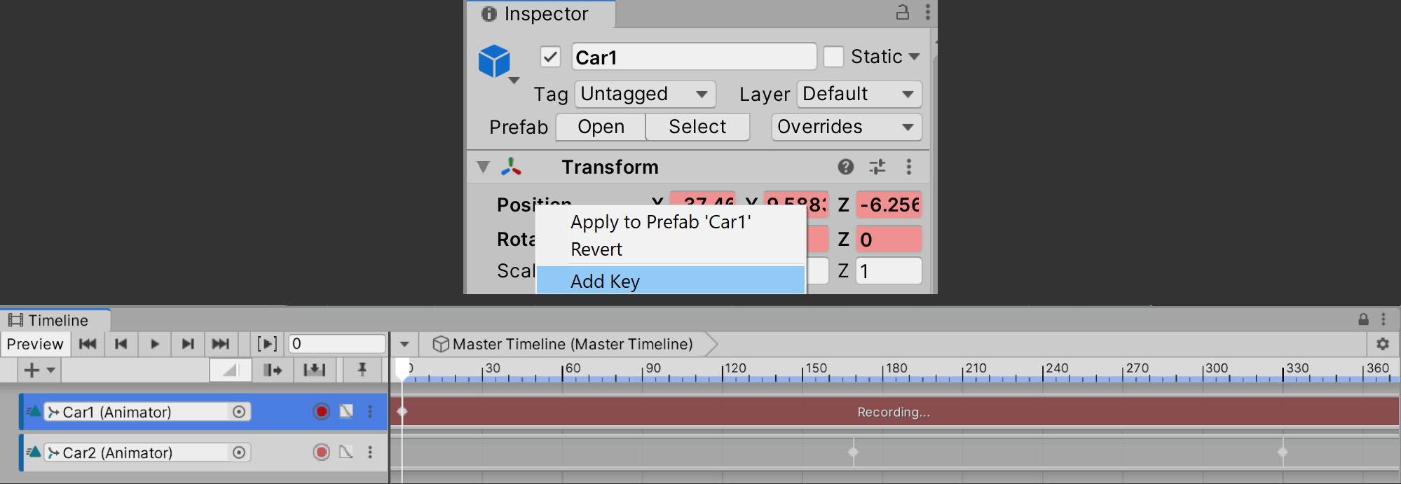 7. In the Inspector, navigate to the car's Transform component, then right-click over the Position parameter and select Add Key.