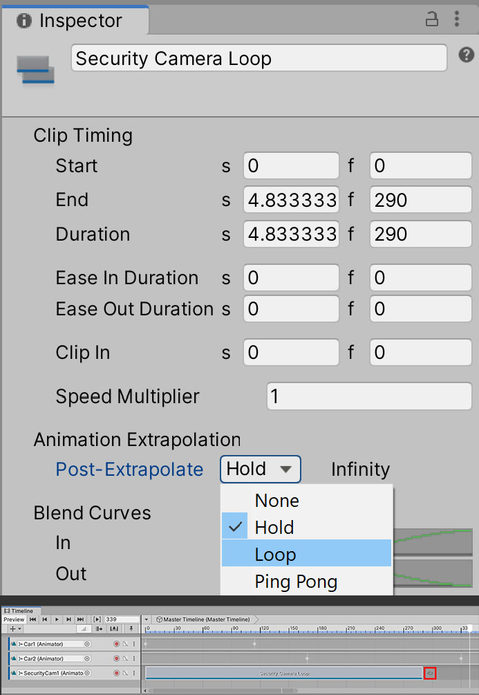 Every Animation Clip in Unity has a Pre-Extrapolate and Post-Extrapolate property. This means you can tell Unity what you want to happen before or after a clip is played. You will see the default value for the Post-Extrapolate setting is Hold — which means that when the clip is done, Unity will hold the pose from the clip's last frame forever.