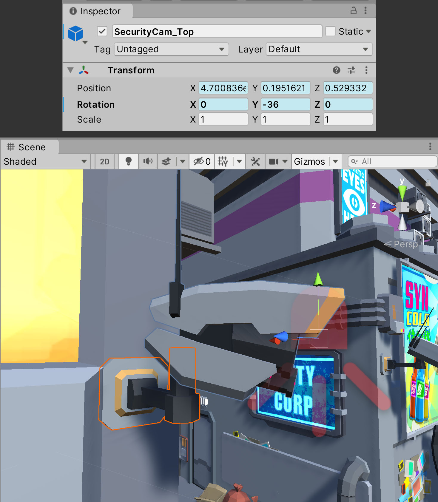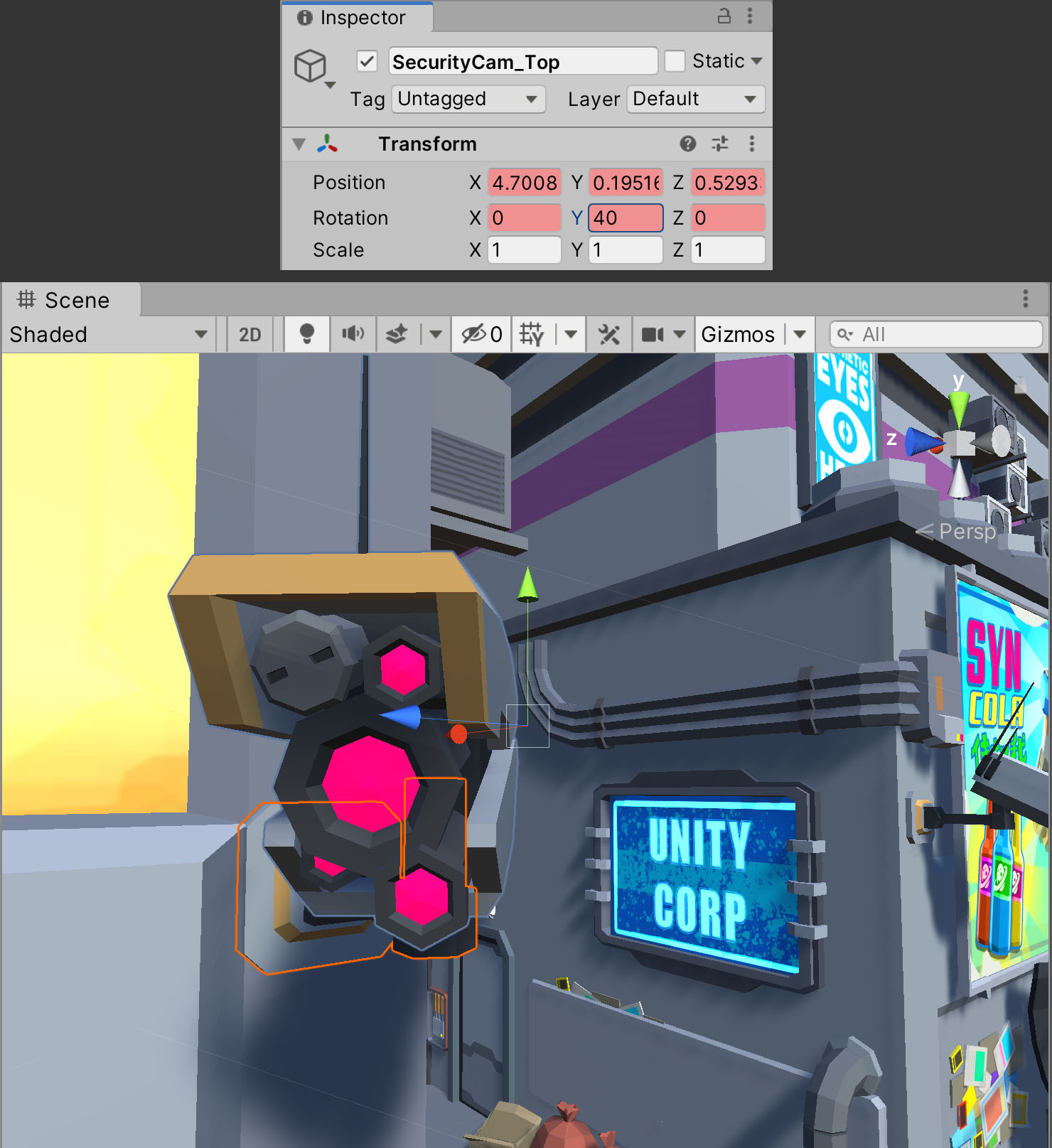5. Select the SecurityCam1 GameObject in the Hierarchy and expand it to reveal the SecurityCam_Top GameObject. Select this GameObject.