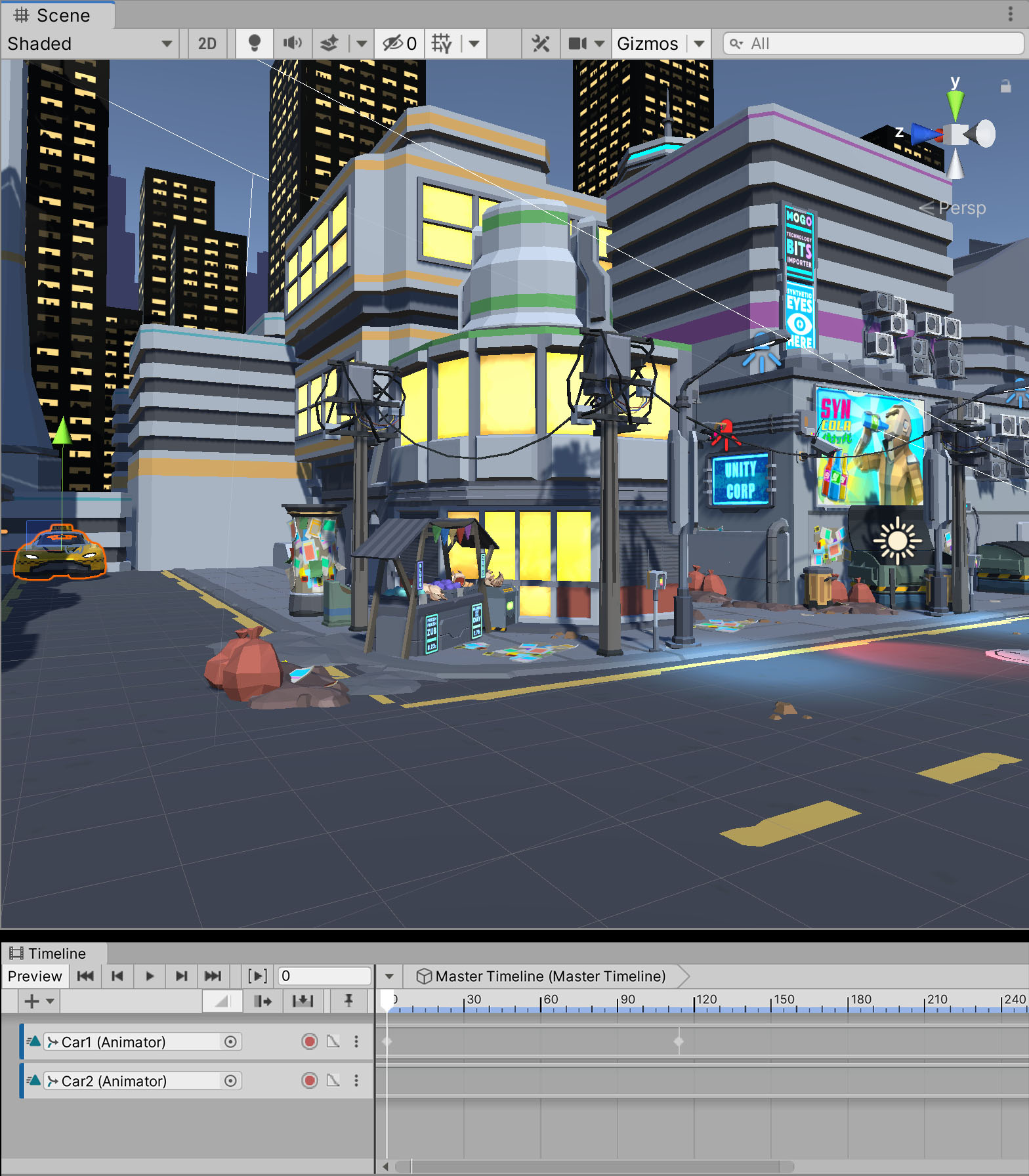 8. Now move the white playhead to Frame 330, select Car2 in the Scene view, and drag on the blue z-axis to move the car forward until it passes the blue Syn Cola sign on the right side of the screen. If your car is moving sideways rather than forward, ensure that you are in Local rather than Global mode (Figure 12) A second keyframe will automatically be created. Click the Record button again to stop animating.
