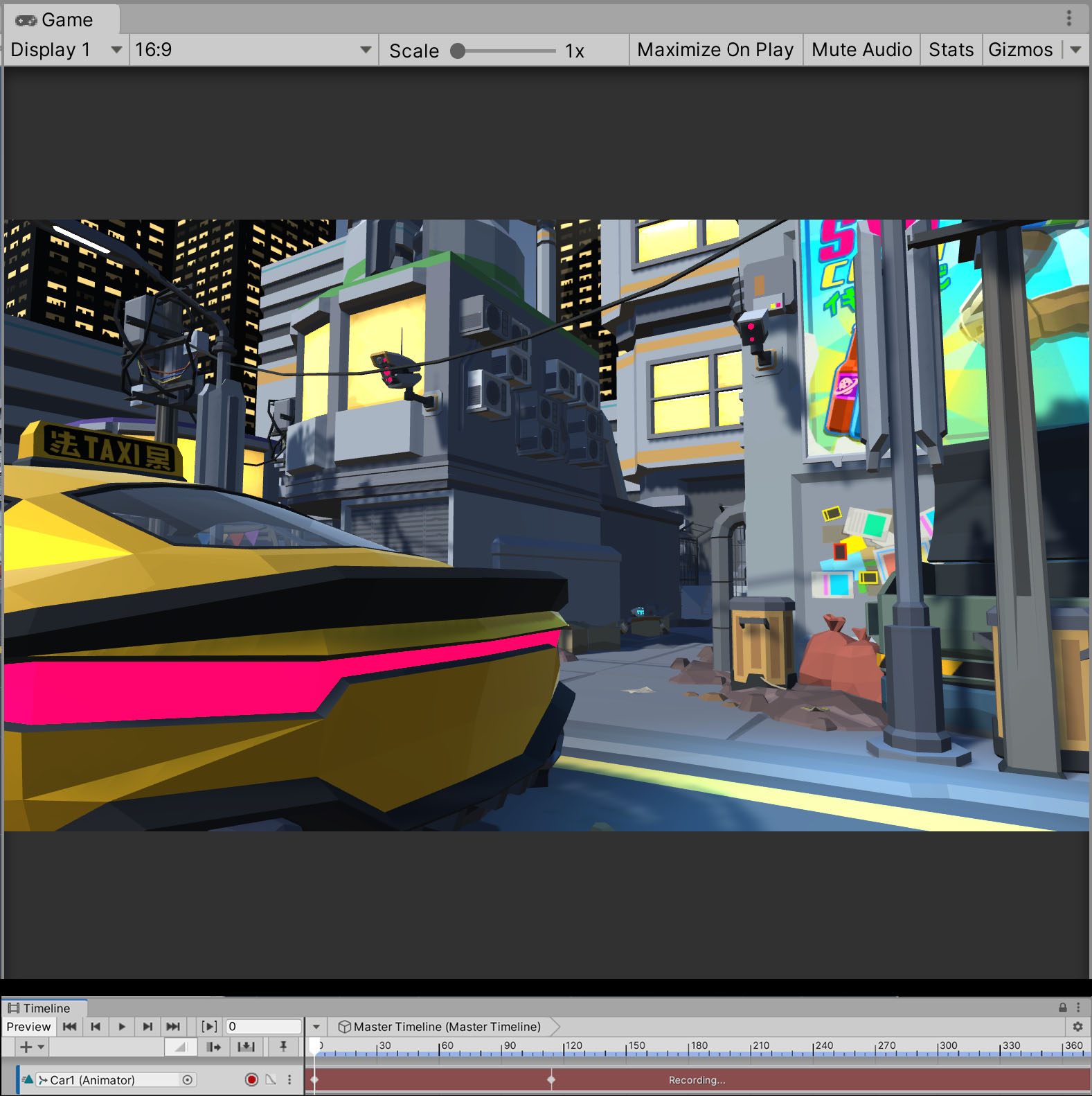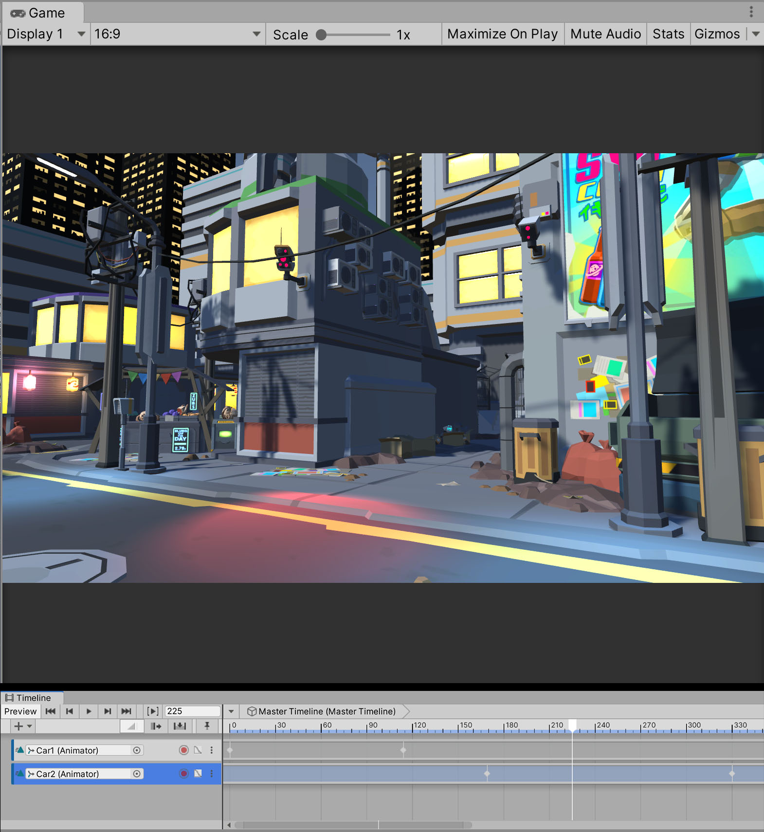8. Now move the white playhead to Frame 114, select Car1 in the Scene view and drag on the blue translation gizmo to move the car forward until it reaches the intersection on the on the left side of the Game view (right before the pink and orange lanterns). A second keyframe will automatically be created. Click the Record button again to stop animating (Figure 09).