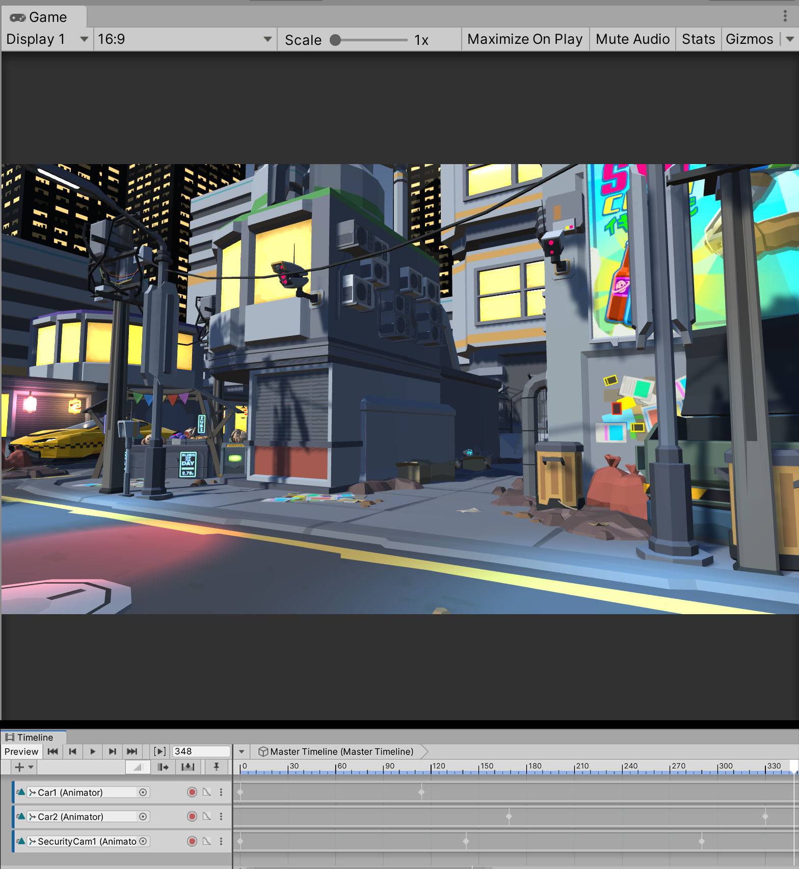 Prior to this unit, we’ve only been working in the Scene view. The Game view is what the main Unity Camera sees. In a game, the Game view usually follows the character. In an animation or a film, camera movements help tell the story. For our purposes, the Game view camera in this project is set to a wide establishing shot focused on the corner and the alley. We’ll dive deep into cameras in Unit 5.